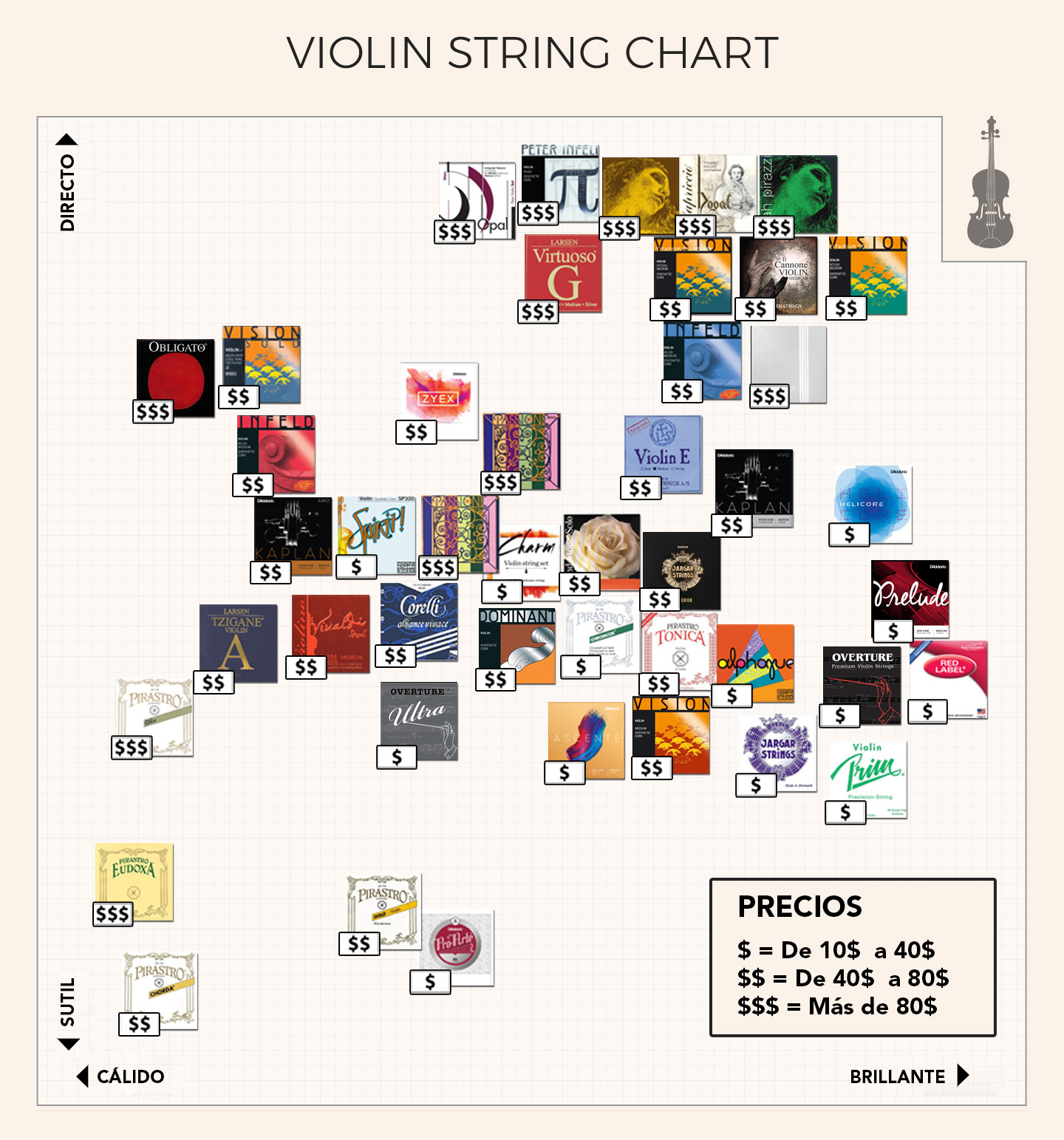 La web sobre productos de violín Sharmusic.com, publica el siguiente cuadro sobre las propiedades de las cuerdas más utilizadas. Nos puede servir para hacernos una idea de las características de cada una, para poder elegir mejor en función de lo que le vaya a nuestro violín. Aunque definiciones como "sutil" y "directo" no son muy precisas, podríamos pensar quizás en volumen y potencia. La calidez y el brillo sí son conceptos más inteligibles.