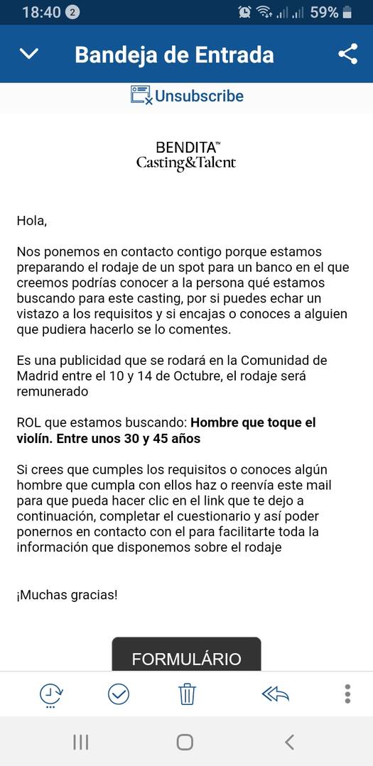 La agencia Bendita, Casting & Talent está buscando un hombre entre 30 y 45 años para aparecer en un spot para un banco. Debe saber tocar el violín y se rodaría entre el 10 y el 14 de Octubre de 2022, el rodaje sería remunerado (alrededor de 800€ brutos) y probablemente sería por la noche.