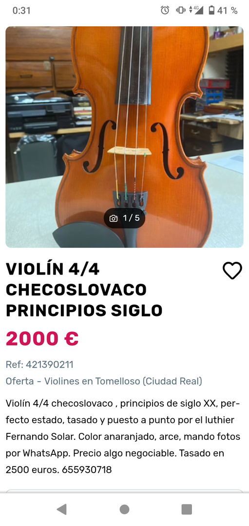 Hace unos años llegó a mis manos un violín . Y me lo taso Fernando Solar ya que no tenía etiqueta . Y le hizo una puesta a punto. Dónde podría venderlo ya que no se tocarlo ........ Lo vendo por debajo de su tasacion. Actualmente lo tiene el profesor de conservatorio para que no esté parado. Esta tasado en 2500 pero escucho ofertas. Y si alguien me ayuda a verderlo en un precio razonable estaría dispuesto a darle hasta el diez por ciento. Un saludo.