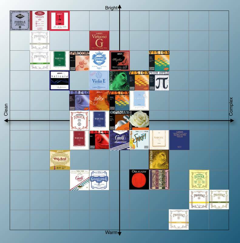 Te dejo un par de tablas de cuerdas con sus características, por si te pueden orientar. También te recomendaría que visitaras la web de Pirastro y su buscador de cuerdas, donde puedes ver las características (teóricas, siempre hay un poco de marketing en todo eso) de cada una. Thomastik también tiene un interesante buscador de cuerdas que te guía según las características que busques, aunque que yo sepa no fabrica cuerdas de tripa.
