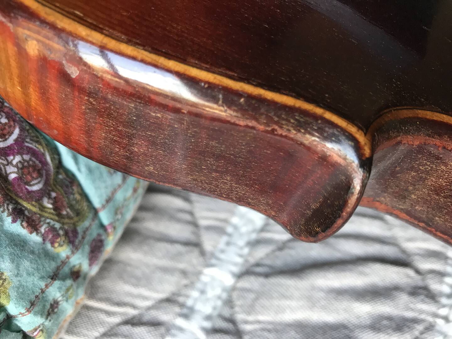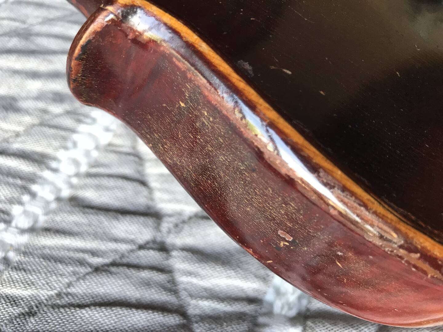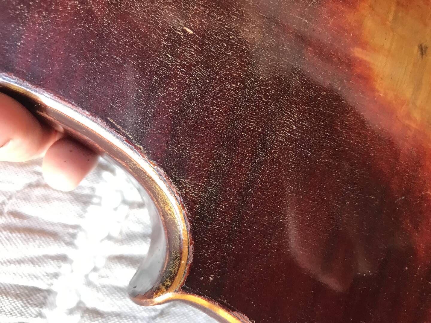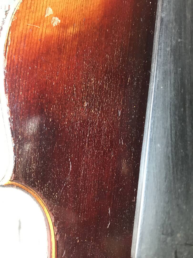 He visto que en algunas partes del violín, se han despegado pequeñísimas partículas de barniz, pasando la mano sobre ellas se quedan entre los dedos.