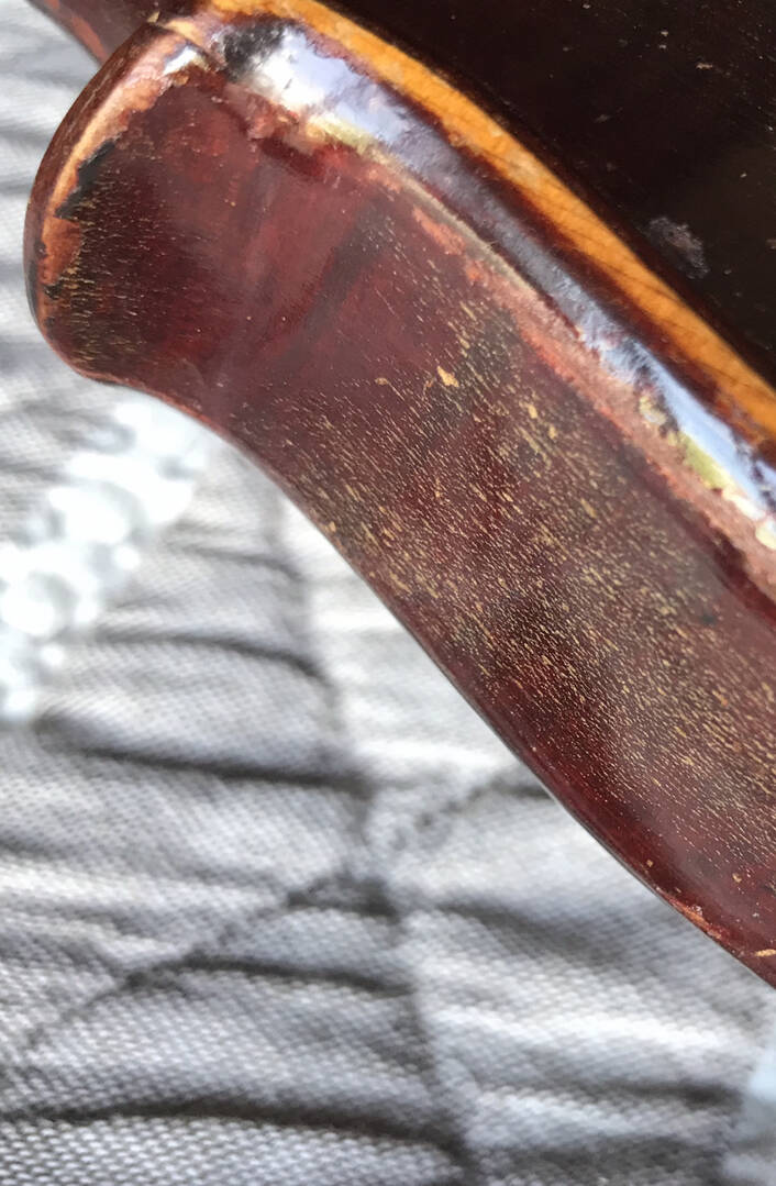 En mi experiencia este tipo de instrumentos tienen un barniz muy duro y frágil, posiblemente un barniz de colofonia diluída en esencia y que es muy fácil que se vayan deteriorando con el uso y el roce.