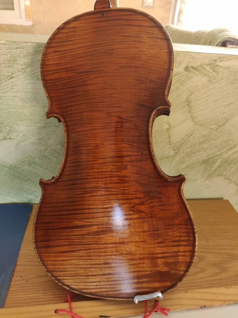 Como comenté al principio este violín me llegó en pésimas condiciones. El violín tiene un label de " Gennaro de Luccia fece en Casigliano Cilento en 1964(Salerno)", lo compré online(me hizo mucha gracia que el supuesto(seguramente una pegatina falsa) liutaio es de un pueblo cerca del mio,soy italiano) tiene una tapa trasera muy muy bonita con un flameado muy pronunciado, claramente el violín tenia que estar en optima condiciones según el vendedor..cosa que no resultó ser así. Venia sin puente, ni alma ni clavijas..y roto, mal pegado etc..la grieta grande en diagonal estaba cerrada con superglue, con 3-4mm de superglue arriba y abajo, además con la madera solapada. Cuando lo enseñé al profesor de violín de mi hija me digo que la reparación seria muy cara, cosa que no podia pagar, como no pude devolverlo decidí "repararlo".