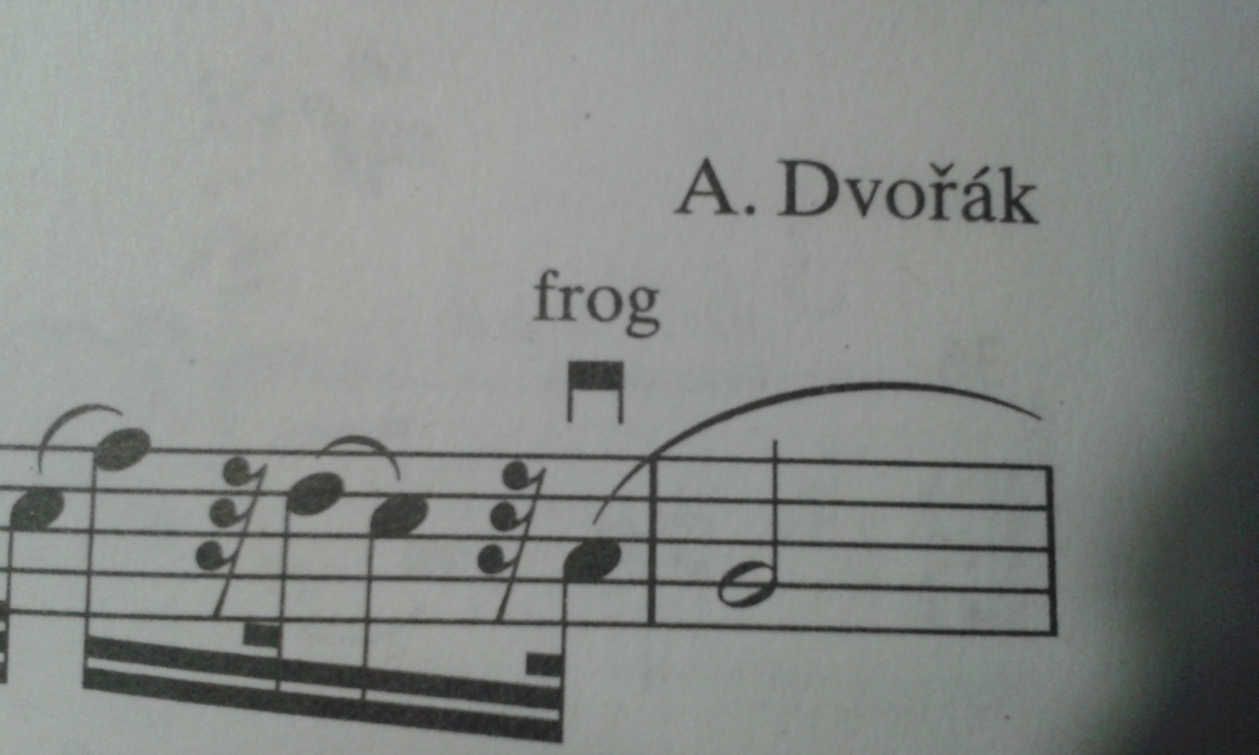 Frog es como se llama a la nuez del arco en inglés. Intuyo que ese golpe de arco hay que iniciarlo muy desde el talón, porque luego vienen notas largas ligadas y vas a necesitar mucho arco.