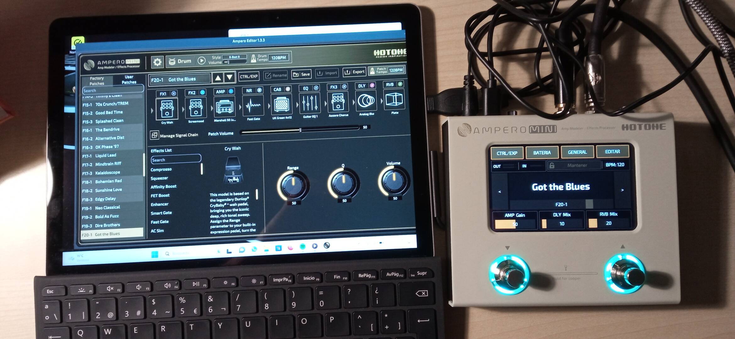 Bueno, Jesús, al final me decidí por el Hotone Ampero Mini. No tiene pedal pero para el violín, de momento, tampoco me hace falta, aunque se le puede conectar un pedal de efectos porque tiene una entrada para ello. Como puedes ver lo estoy probando con una tablet con la aplicación que te puedes descargar de Hotone, aunque con la pantalla táctil lo controlas perfectamente también. Una gran ventaja es que si le conectas los cascos puedes obtener muy buen sonido, eliges un amplificador, un altavoz, un micro y una posición de micro para hacerlo más realista, lo aderezas con un pelín de rever y listo y sin cargar con el combo ni molestar a nadie. Además tiene un precio muy contenido: 220 €. Un saludo.