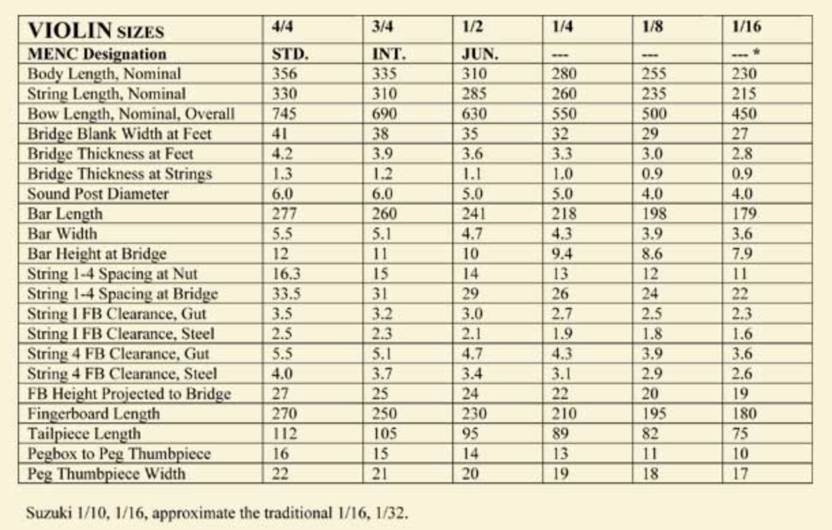 Escribo de nuevo, he encontrado esta tabla ( https://woodsoundstudio.com/setup.htm) en la que se indican ciertas medidas en función del tamaño del violín.