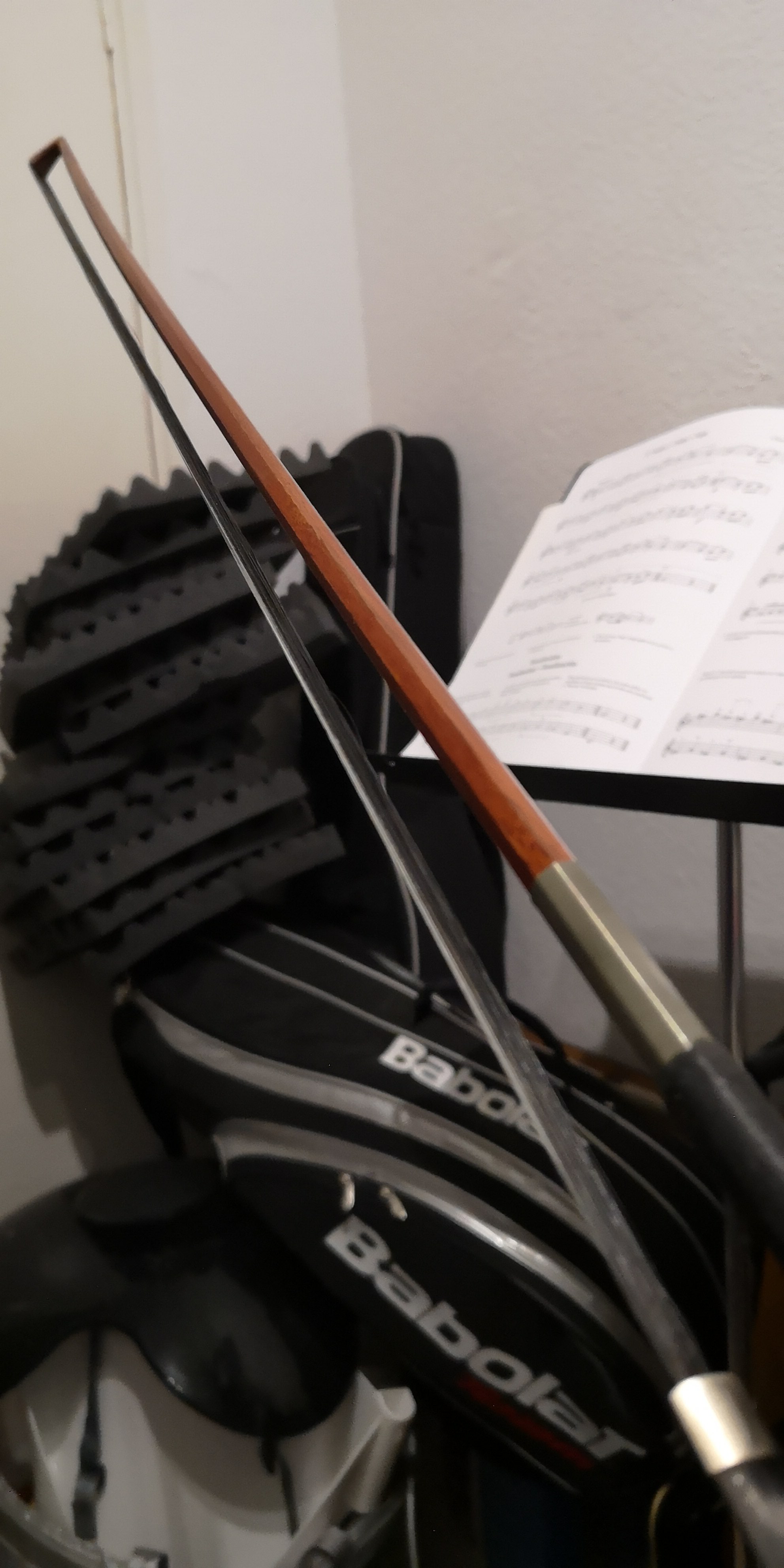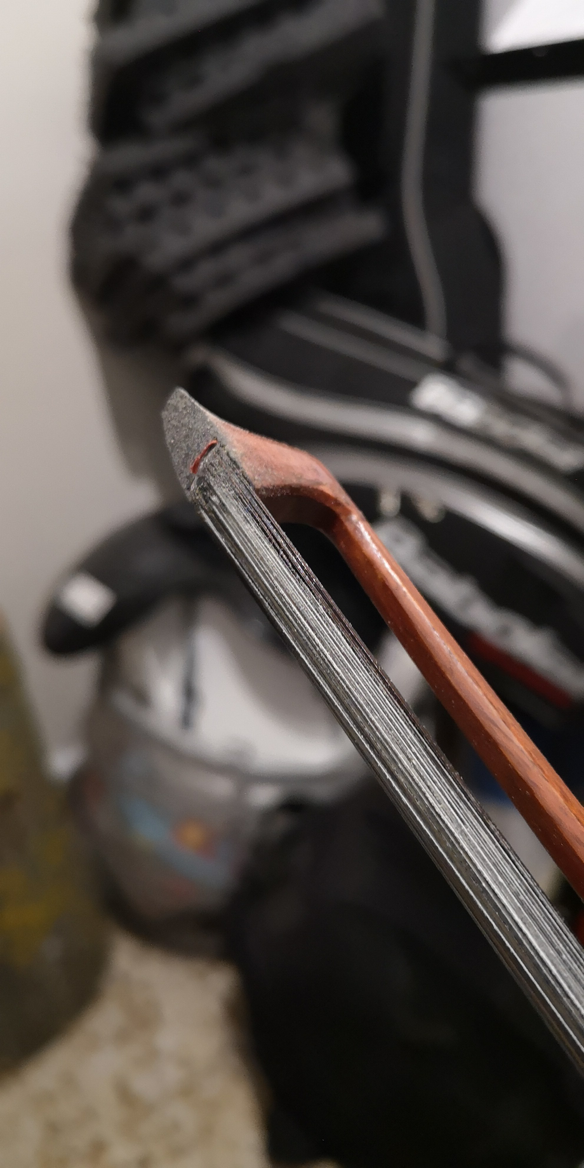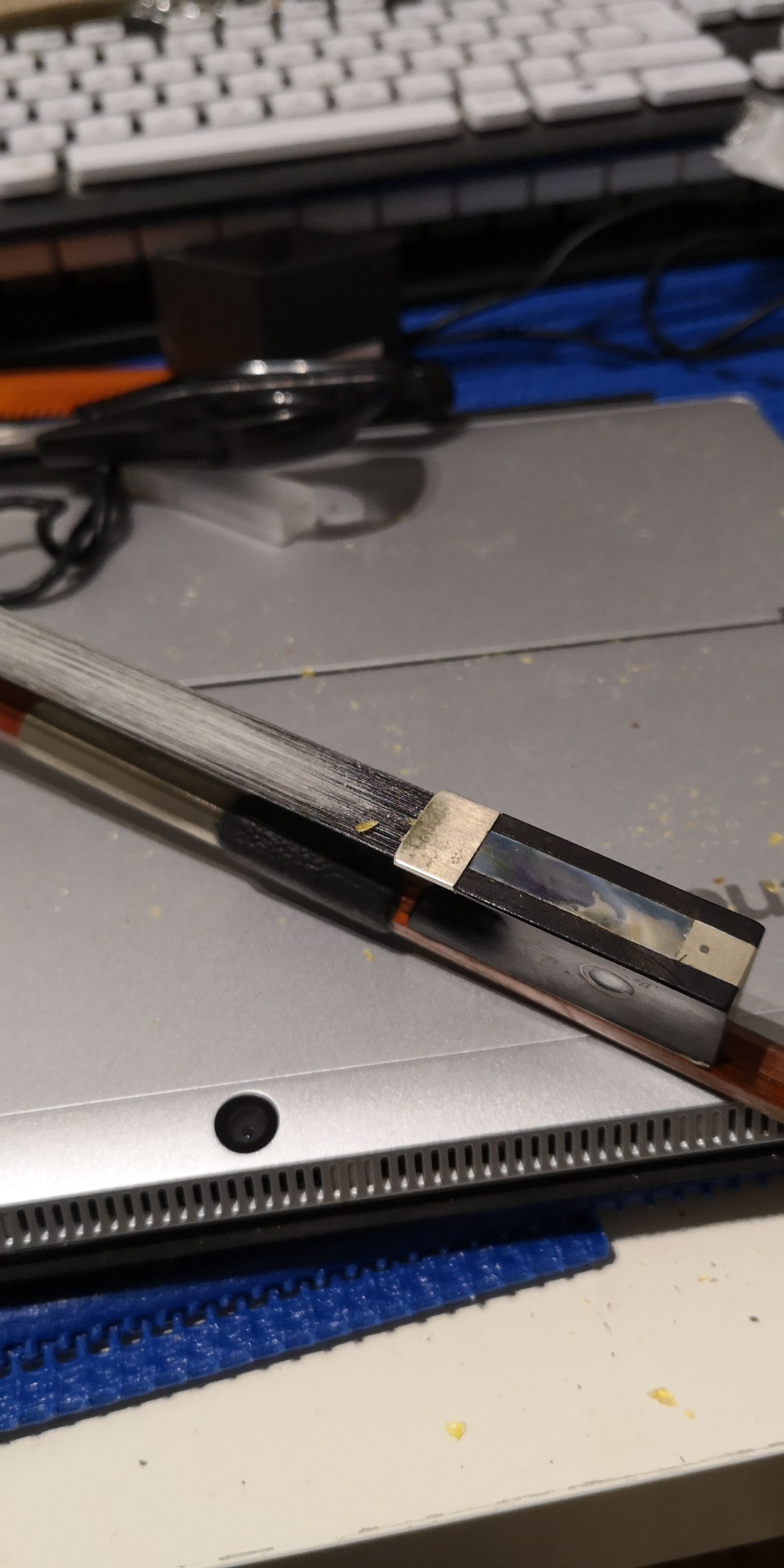 Para empezar, desmontar la tapa de la nuez es fácil porque no suele pegarse con pegamento; la de la punta es más complicada porque puede haber sido pegada como en mi caso. Tuve que romper el taco de madera que sujetaba las crines a la punta y, en el proceso, rompí el embellecedor blanco de la misma (tengo la sospecha de que ya estava medio roto). Tengo pendiente comprar un sustituto, a poder ser de hueso o hacérselo a medida, y ponérselo en el próximo encerdado.