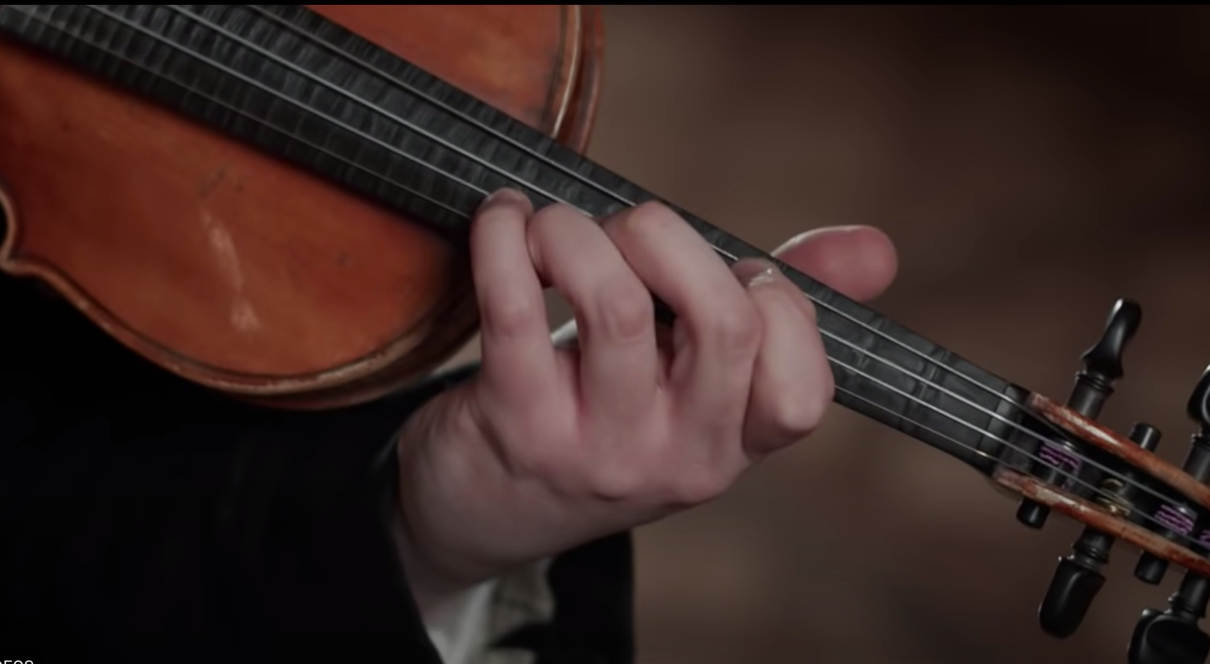 En un instrumento con trastes convencionales el dedo pulsa, no sobre el traste sino un poquito detrás, con un margen más o menos amplio, porque es el traste el que define la longitud de cuerda vibrante. Esto, para un violinista normal, implicaría tener que redefinir la posición de todos los dedos a una posición un poco más retrasada (como hago yo, por ejemplo, cuando toco la mandolina, que es como un violín con trastes). Además, un traste utilizado de la forma convencional mitigaría mucho el efecto vibrato, ya que la nota siempre está definida por el traste y no por el contacto del dedo con el diapasón. Pero Roman aquí realiza varios vibratos bastante competentes, y es que mirando de cerca los dedos parece estar colocándolos justo sobre el traste en vez de detrás.